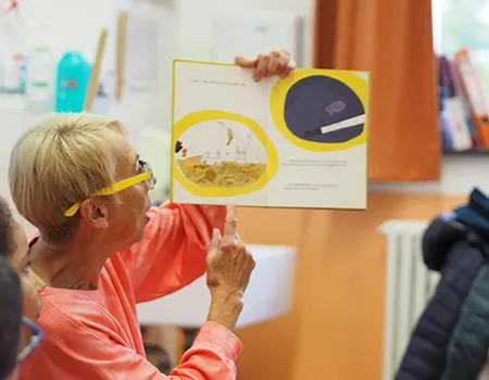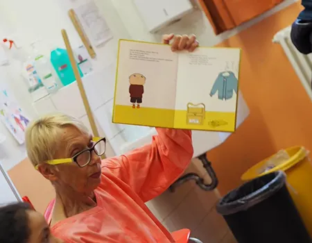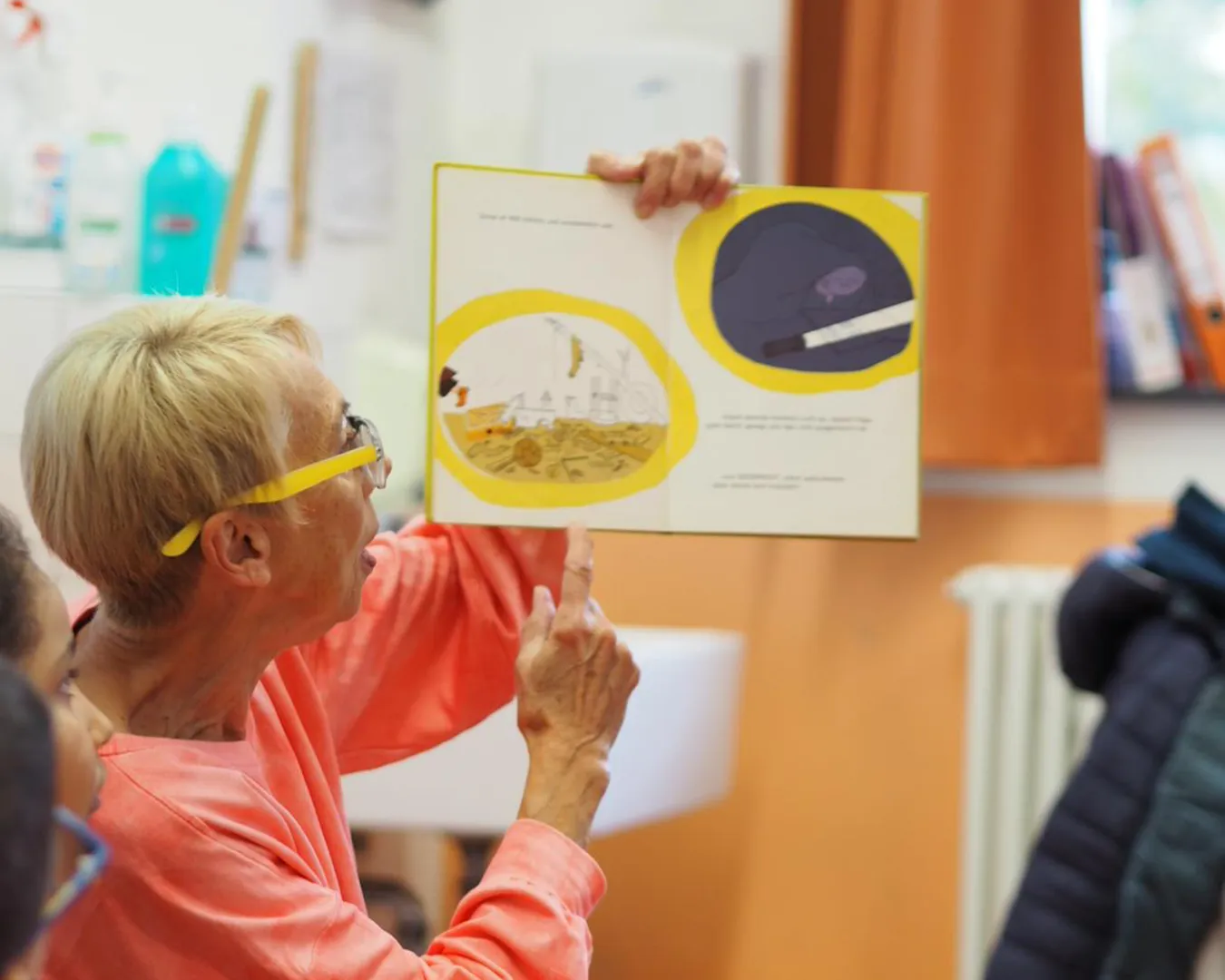 Frau Mandera zeigt den Kindern eine aufgeschlagene Seite in einem Bilderbuch.