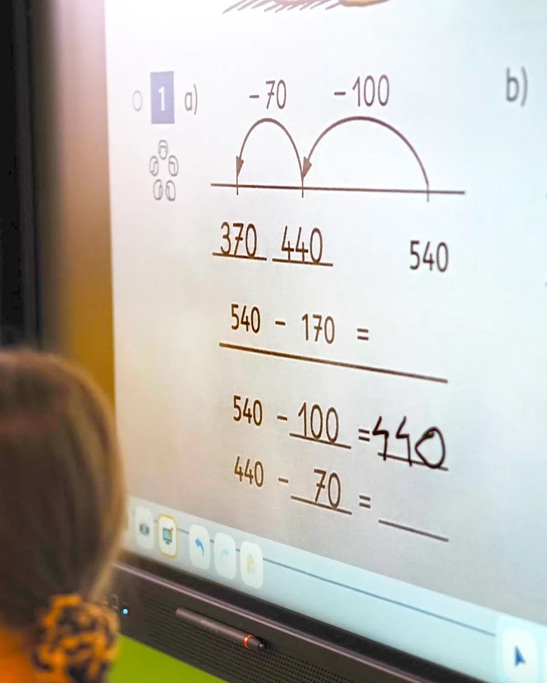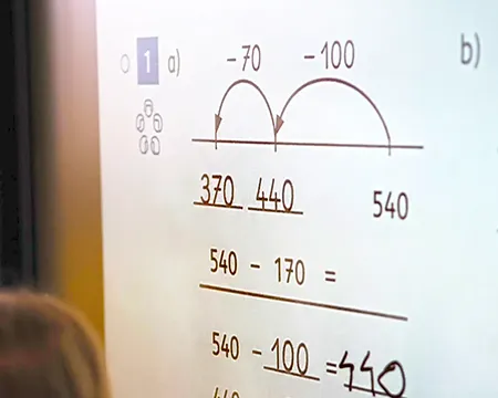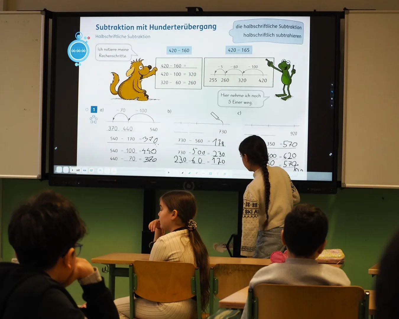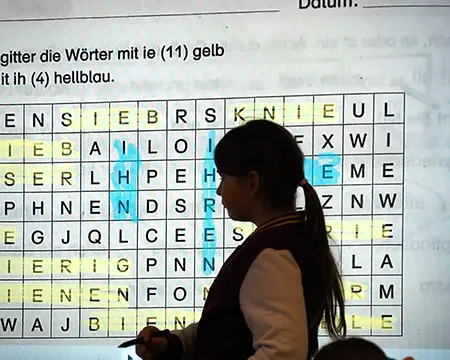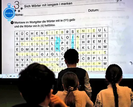 Fotogalerie: Kinder der Klasse 3d an der digitalen Tafel und beim Arbeiten in eigenen Arbeitsheften.
