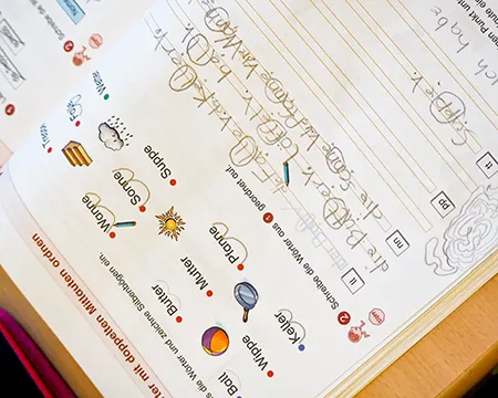 Zuerst haben sie an der Tafel geübt. Danach durften sie im Arbeitsheft schreiben und das Gelernte anwenden. So macht Deutschlernen Spaß!
