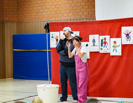 Fotogalerie: Die theaterpädagogische Werkstatt führt die „Nein-Tonne“ vor den Kindern der zweiten Jahrgangsstufe auf.