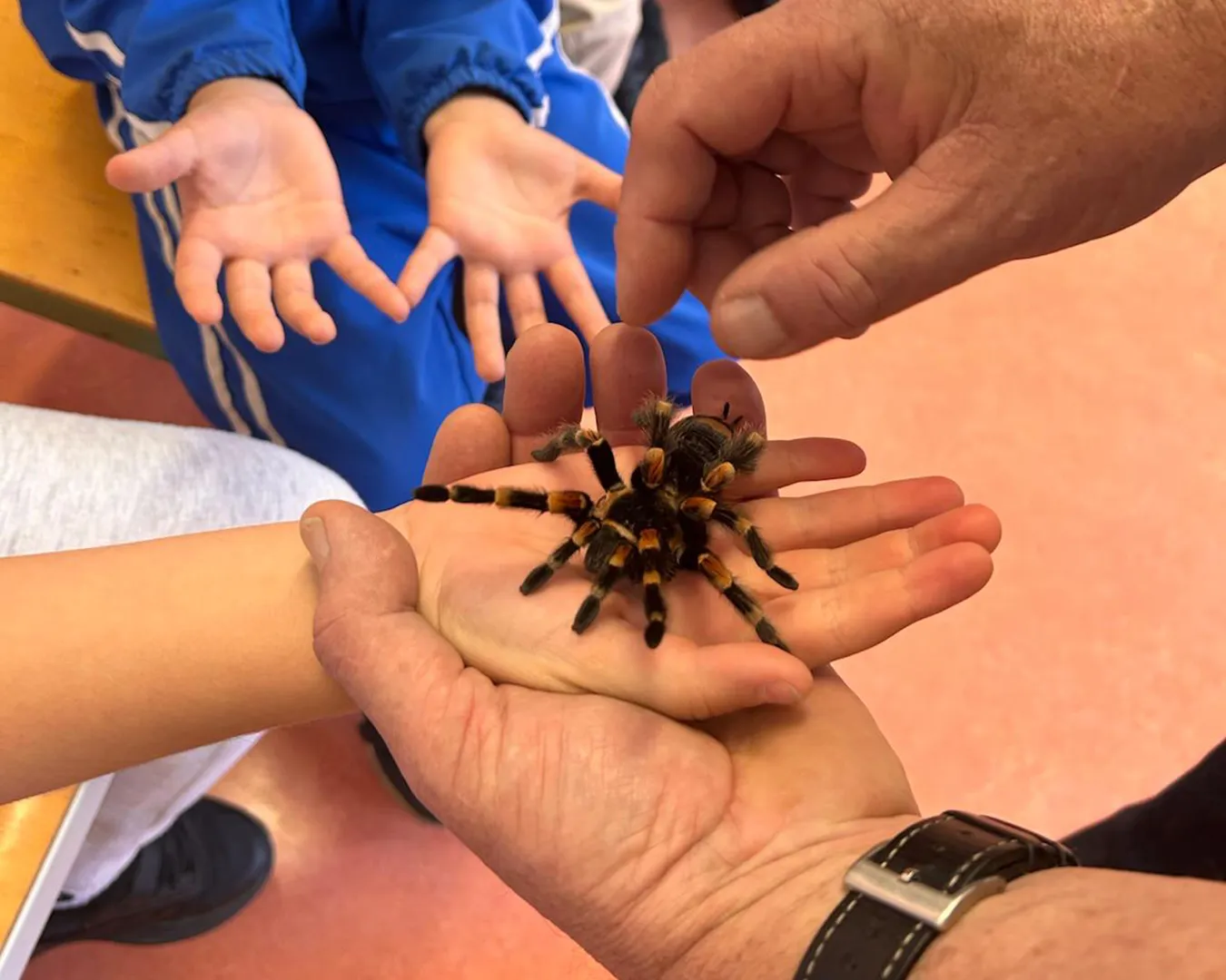 Fotogalerie: Herr Dr. Loksa zeigt den Kindern aus dem zweiten Jahrgang verschiedene Spinnenarten und seine Vogelspinne Klara.