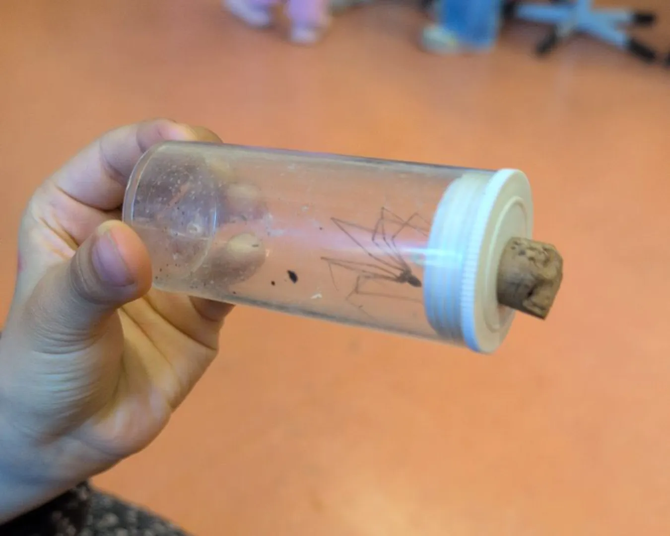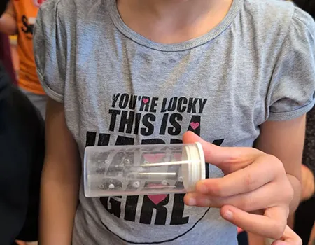 Verschiedene Spinnenarten werden entweder in einem Röhrchen gezeigt oder den Kindern direkt auf die Hand gesetzt.