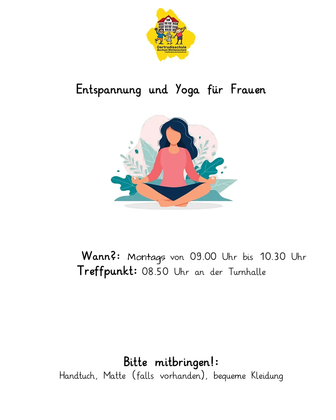 27. Okt | 9.00-10.30 Uhr Yoga und Entspannung für Frauen Treffpunkt um 8.50 Uhr am Schuleingangstor |